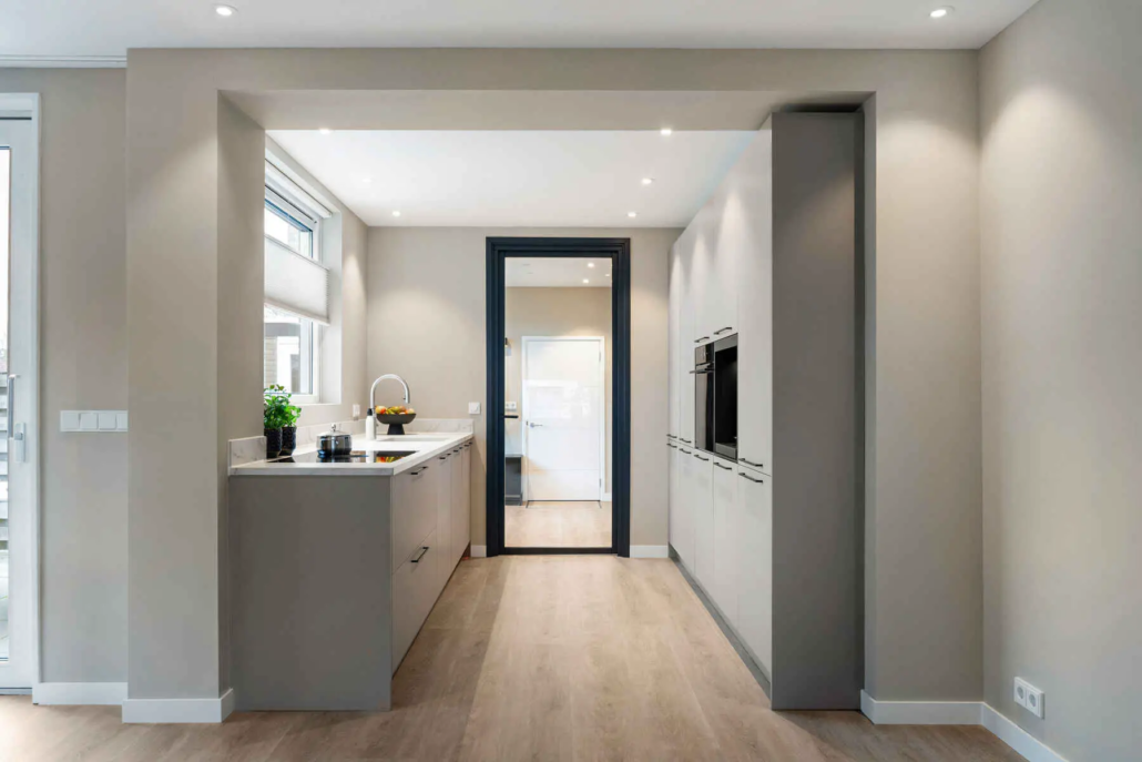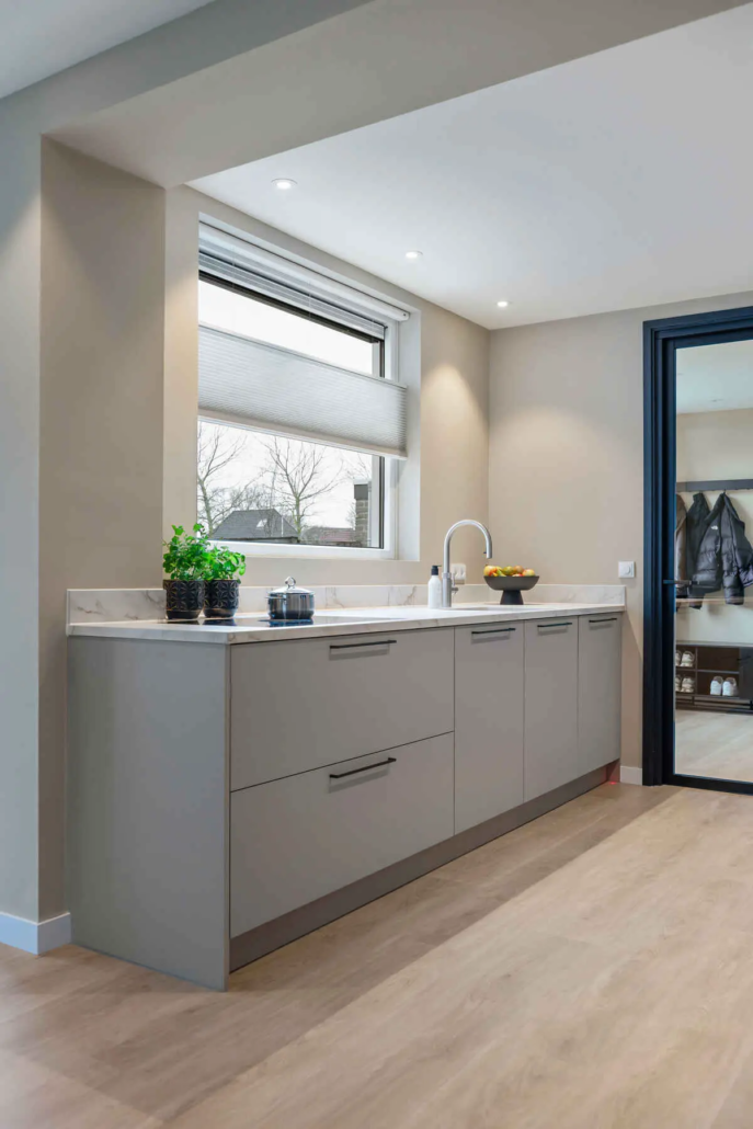 “Toen hebben ze dat getekend. Er zit nu een deur met glas tussen, dus je kijkt er wel doorheen, maar het is één geheel geworden.” Keuken en bijkeuken hebben nu dezelfde uitstraling. “Ik ben daar gewoon heel blij mee. De keuken ziet er strak en rustig uit.”