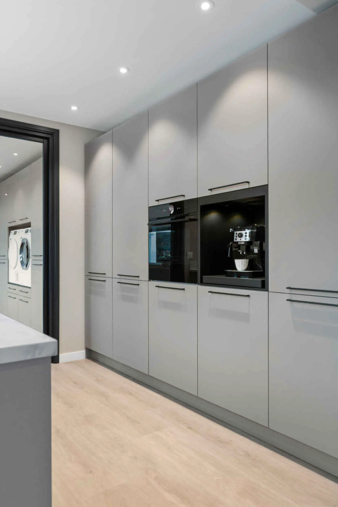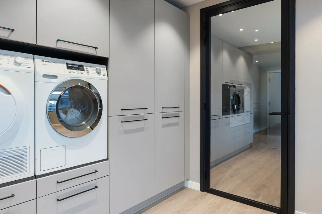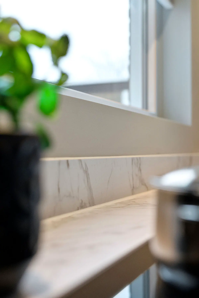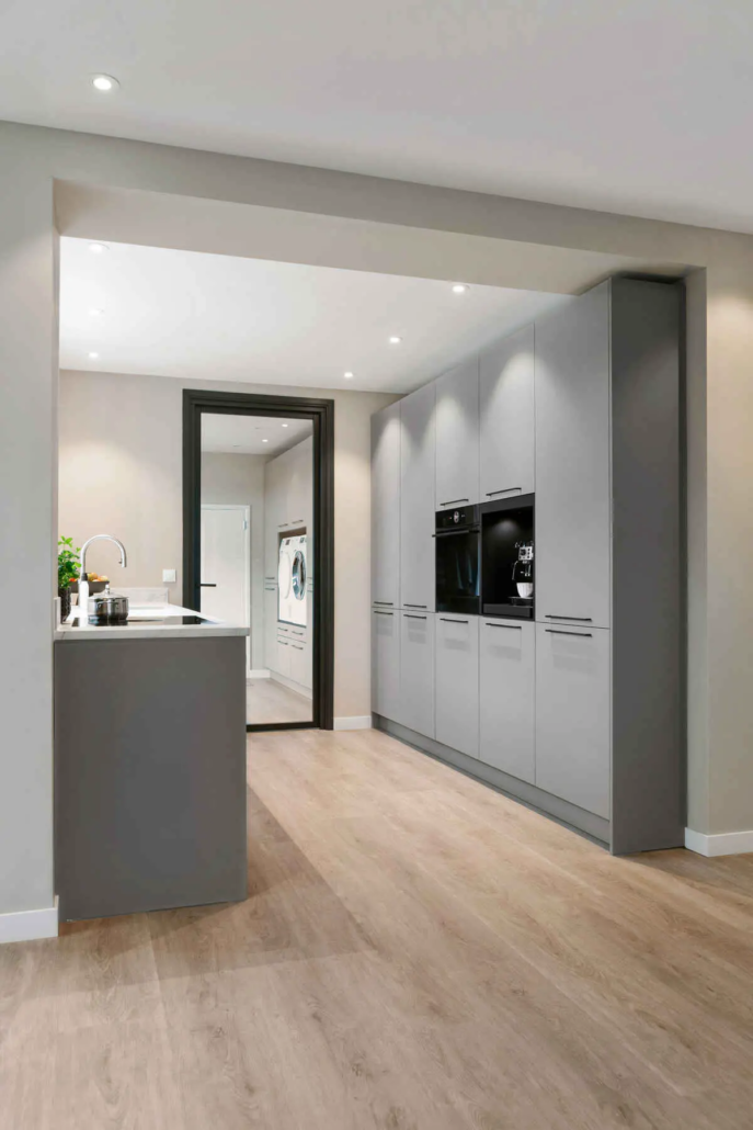 Een belangrijk keerpunt kwam toen Edith online keukens van andere klanten bekeek. “Ik had al een bijkeuken, maar dat waren schuifdeuren met planken erachter. Dat mag allemaal wel wat strakker.” Ze zag een voorbeeld waarin inbouwkasten waren toegepast en wist meteen: dat wil ik ook.